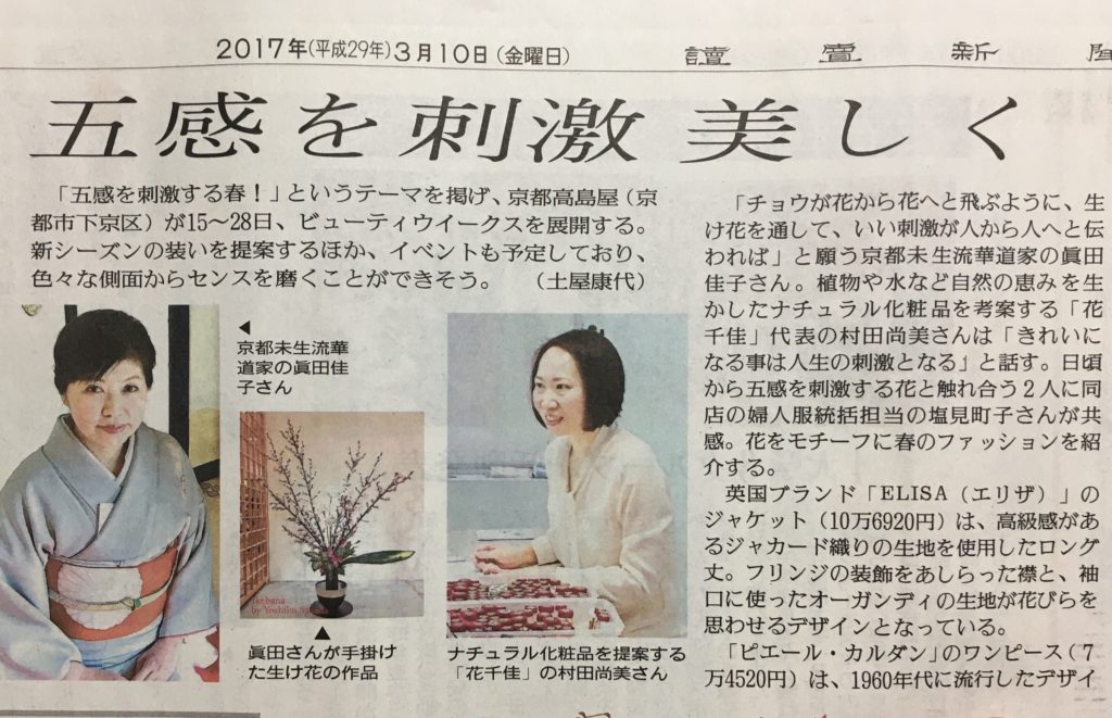 少し前になりますが、読売新聞滋賀版の髙島屋京都店様でのご紹介の中で花千佳についても記事を掲載いただきました。 五感を満たすこと、日常でも心がけていきたいですね... -